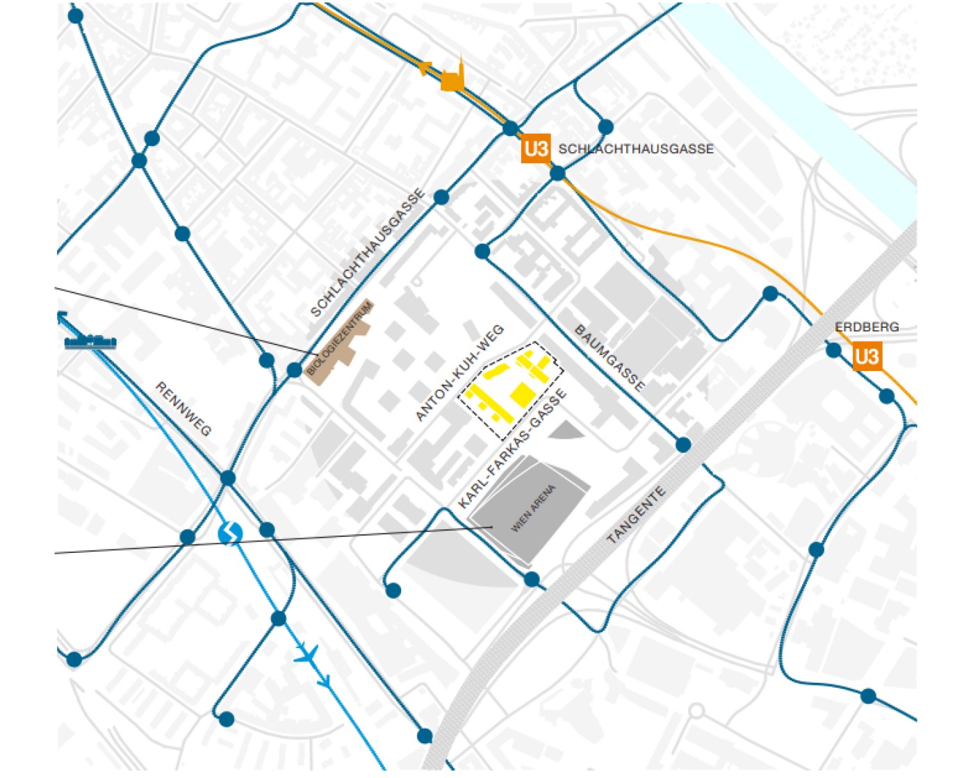 Das Wohnhaus ist der Start für die Verbauung der ehemaligen Schlachthausgründe, für die weiteren Arealflächen ist derzeit das Widmungsverfahren im Laufen. In den nächsten Jahren werden hier weitere Wohnbauten, Büros und Kleingewerbebetriebe rund um die denkmalgeschützte Marx Halle einen attraktiven Stadtteil entstehen lassen und den Wert der gerade fertiggestellten Wohnungen überdurchschnittlich steigern. Ausreichend Grünflächen sind schon alleine durch die unter Naturschutz stehende „Erdberger Stadtwildnis“ an der Nordwestseite der Liegenschaft garantiert.