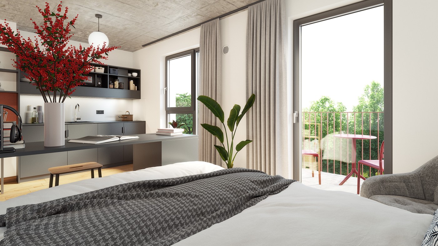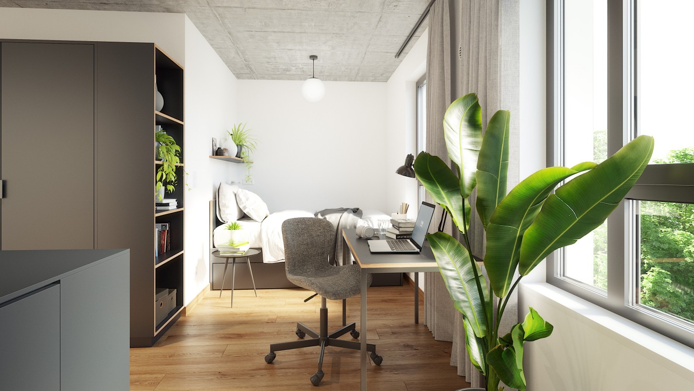 The student residence with 418 single- and double rooms will be ready for occupancy at the beginning of the upcoming winter semester 2024. The 48 serviced apartments as well as retail and office space will also be completed in the first quarter of 2025. All residential units will be fully furnished. The building will also feature several fitness, music and multi-purpose rooms, as well as a large terrace for tenants' use.